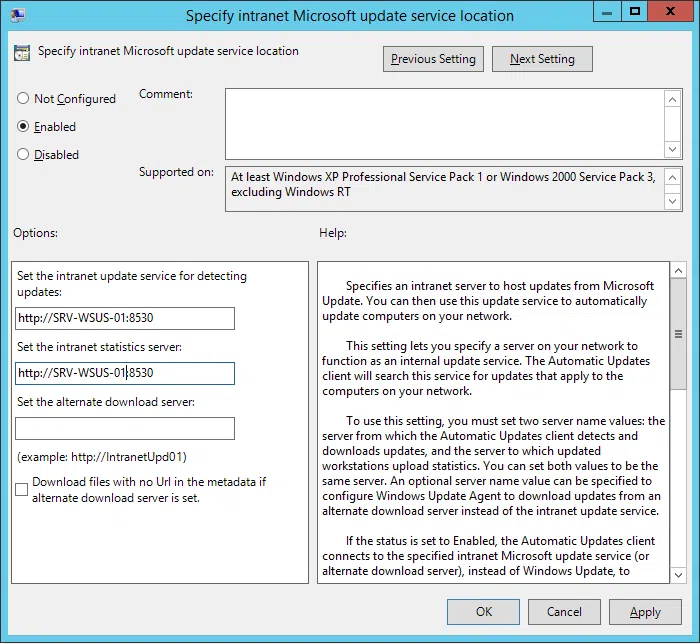 Publikowanie serwera w organizacji polega na stworzeniu obiektu zasad grupowych (GPO) i ustawieniu go w domenie Active Directory. W tym celu na kontrolerze Active Directory tworzymy nowy obiekt zasad grupy i potem otwieramy go w edytorze zasad grupowych. Po otwarciu, trzeba wejść w: Computer Configuration > Polices> Administrative Settings > Windows Components > Windows Update. Następnie w tym folderze trzeba wybrać ustawienie „Specify intranet Microsoft update service location”.