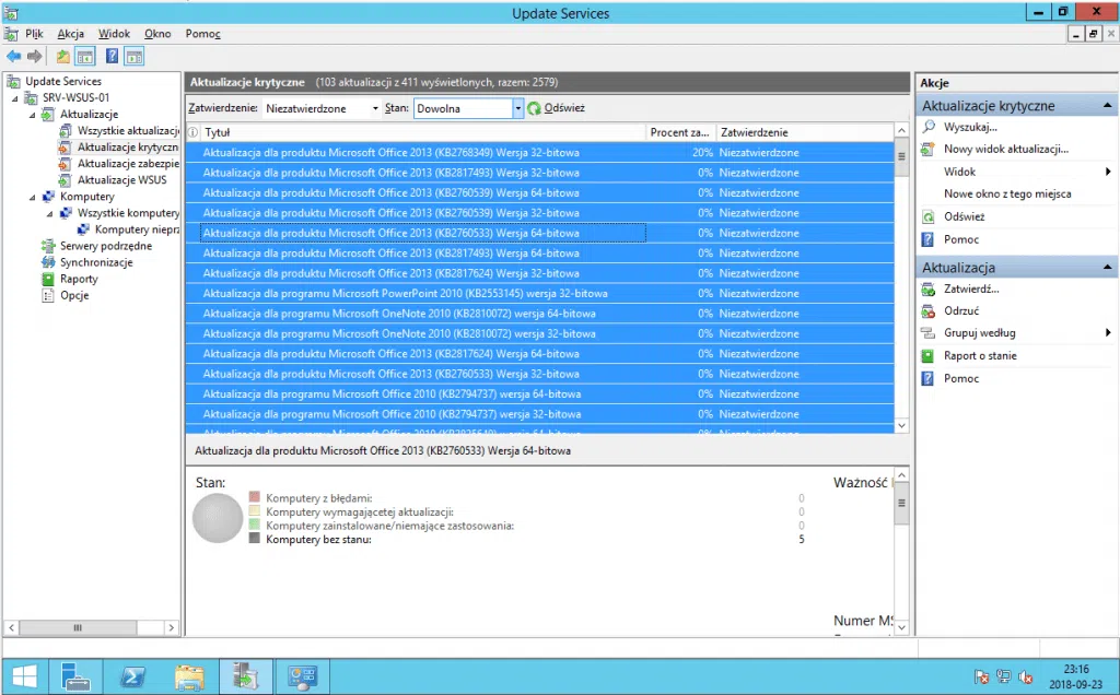 Jeśli wynik ostatniej synchronizacji to „Powodzenie”, tak jak na załączonym zdjęciu, to należy przejść w drzewie konsoli do sekcji „Aktualizacje”. Zatwierdzanie aktualizacji zalecam rozpocząć od widoku „aktualizacje krytyczne”. W tej sekcji polecam zaznaczenie wszystkich aktualizacji i wybranie opcji „Zatwierdź”.